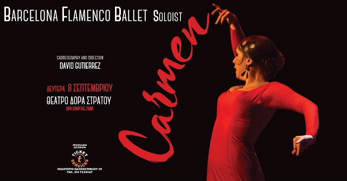 Για πρώτη φορά στην Ελλάδα, οι σολίστ του Barcelona Flamenco Ballet, ενός από τα πιο αναγνωρισμένα και πολυταξιδεμένα φλαμένκο συγκροτήματα της Ισπανίας, παρουσιάζουν τη διαχρονική ιστορία της Carmen, σε μια εντυπωσιακή σύγχρονη εκδοχή με την υπογραφή του διεθνώς διακεκριμένου χορευτή και χορογράφου David Gutierrez.